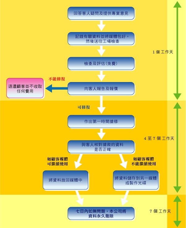 當從客人手上接到需要拯救的媒體,我們即時會送到工作室,等候技術員作初部評估;在下一個工作天,我們即時會向顧客交代初部損毀報告、報價及預計修復時間,在此之前,我們不會作任何行動(有些不良份子會先修理然後才向顧客報價,即使合理不合理都要接受),而且,萬一不能修復又或者所修復的資料不是所需,我們分文不收(亦沒有檢查費)。